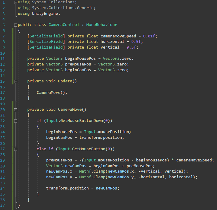Mathf.Clamp를 이용해 새로 계산된 카메라의 Position값인 newCamPos의 최솟값, 최댓값을 지정해 다시 newCamPos에 넣어줍니다.