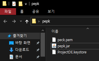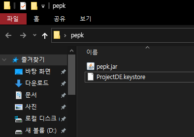 pepk.jar 파일과 키스토어 파일을 새 폴더 안에 위치시킵니다.