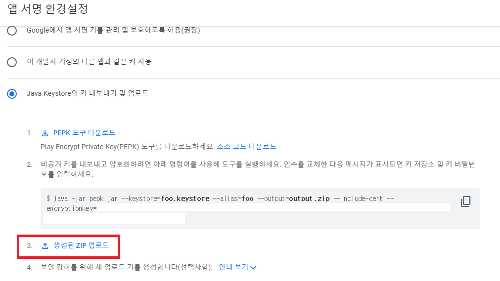 Java Keystore의 키 내보내기 및 업로드를 선택하고 PEPK 도구를 적당한 위치에 다운로드합니다.
