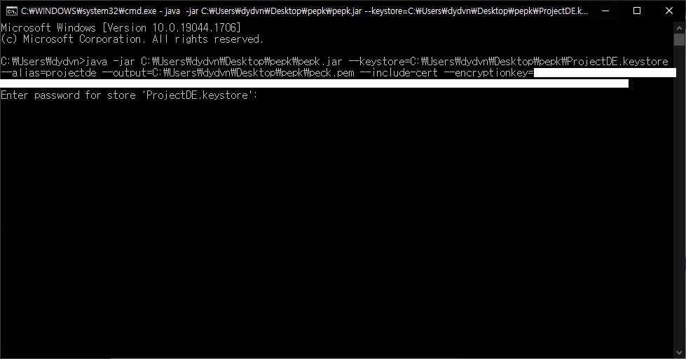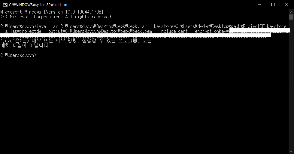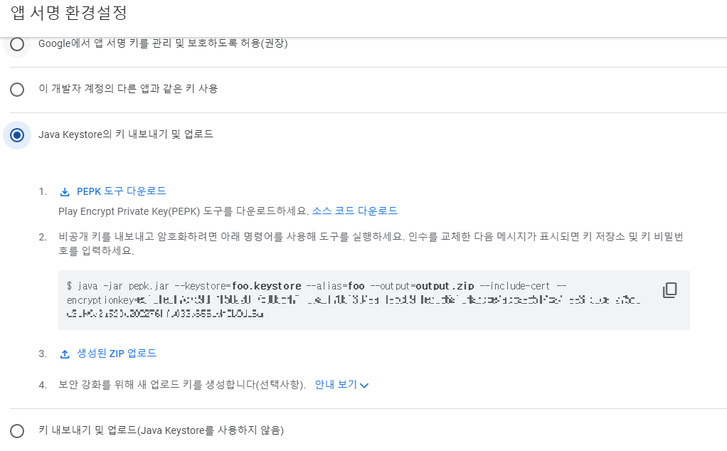 먼저 pepk.jar 파일과 키스토어 파일의 정확한 경로를 입력합니다.