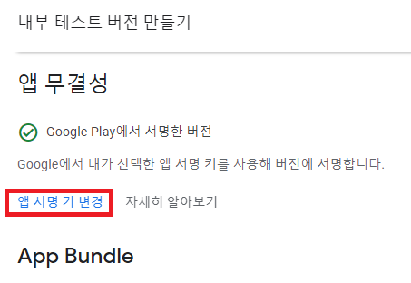 바로 위쪽에 보이는 앱 서명 키 변경으로 갑니다.