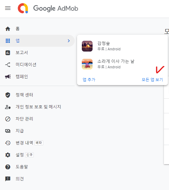 개발자 콘솔로 이동 후, 광고를 등록한 어플리케이션으로 진입한 뒤 왼쪽 메뉴에서