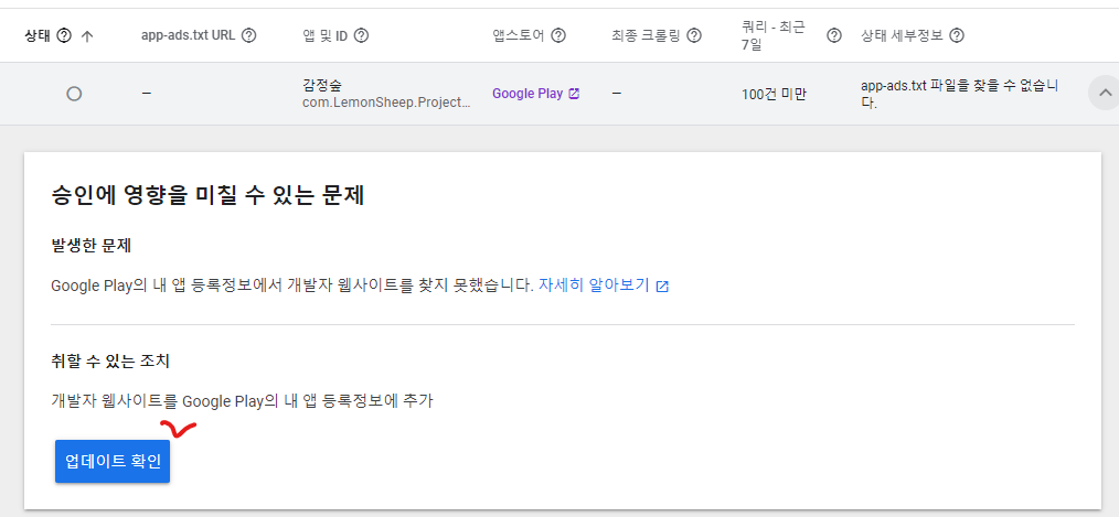 app-ads.txt 파일을 찾을 수 없습니다. 의 오른쪽 화살표를 눌러 아래쪽으로 펼친 후 업데이트 확인을 누르면 수동으로 체크가 가능하다.